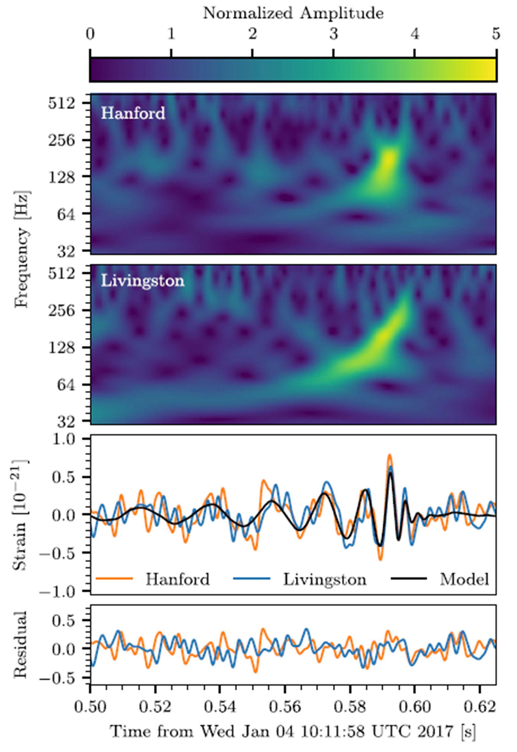 La figura illustra, in alto, la variazione della frequenza in funzione del tempo relativamente ai dati registrati dai rivelatori situati a Hanford e Livingston per la sorgente Gw170104. Il grafico al centro mostra le serie temporali dei dati dai due rivelatori (i dati di Livingston sono stati spostati indietro di 3ms per tener conto della posizione celeste della sorgente e il segno dell’ampiezza è stato invertito per tener conto del diverso orientamento dei rivelatori). La forma d’onda di massima probabilità relativa alla binaria di buchi neri è mostrata in nero. Il grafico in basso mostra i residui tra i dati e la forma d’onda di massima probabilità. Crediti: Abbott et al. 2017