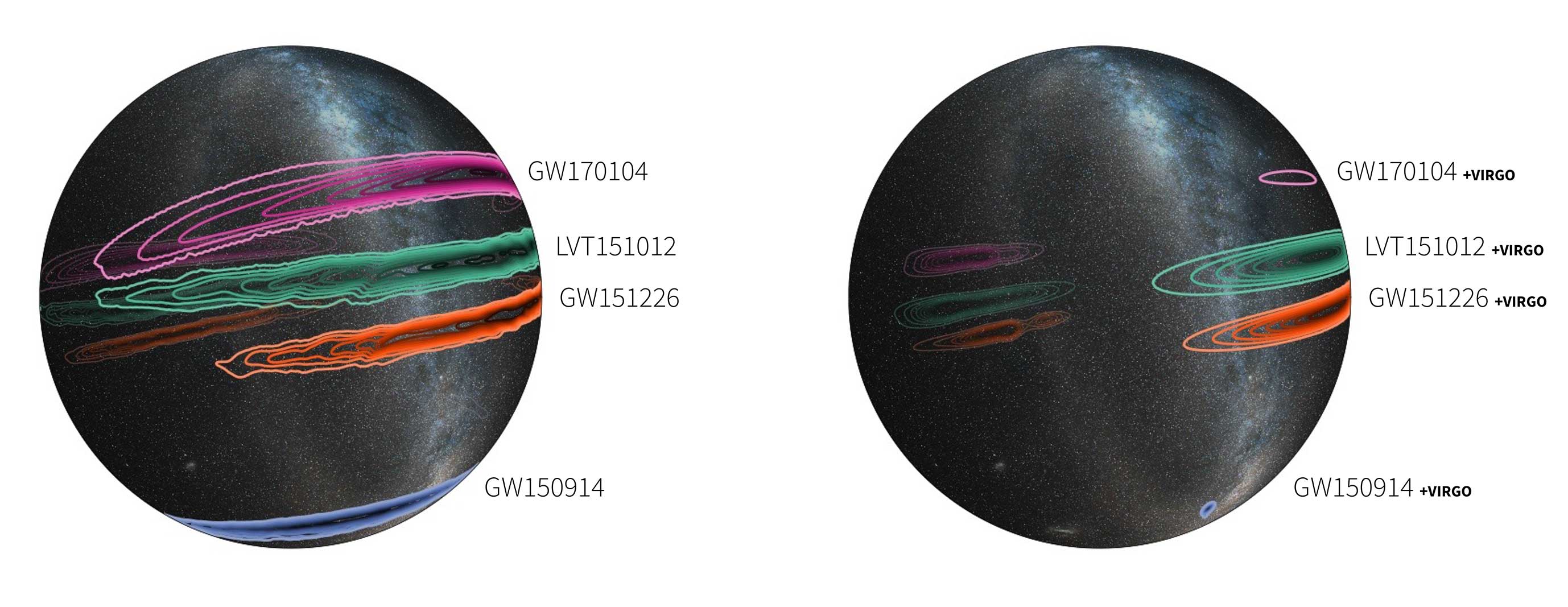 A sinistra, l’immagine raffigura la proiezione tridimensionale della Via Lattea su una sorta di globo trasparente in cui viene mostrata la posizione più probabile delle tre sorgenti di onde gravitazionali confermate da LIigo con una quarta possibile sorgente (Lvt151012). I contorni più esterni rappresentano la regione con il 90 per cento del livello di confidenza mentre quello più interno indica la regione con il 10 per cento del livello di confidenza. A destra, la mappa illustra come l’aggiunta dei dati di Virgo può migliorare la posizione delle sorgenti. Crediti: Ligo / Caltech / Mit /Leo Singer (Milky Way image: Axel Mellinger)