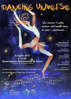 Gran finale sabato 8 luglio quando lo spettacolo “Dancing Universe” (vedi locandina qui sopra) arricchirà l’ultima serata in programma. Un viaggio nei sentimenti dell’universo attraverso la scienza, la musica, la danza, la pittura e la parola. Su un palco si alternano una ballerina (Francesca Schipani), un pianista (Arturo Stalteri), un narratore (Roberto Bragalone), una body painter (Maria Cristina Recupero) e le voci di tre scienziate (Angela Bongiorno, Marcella Di Criscienzo e Silvia Piranomonte) impegnate ogni giorno a ricercare di sé e dell’universo che le circonda.