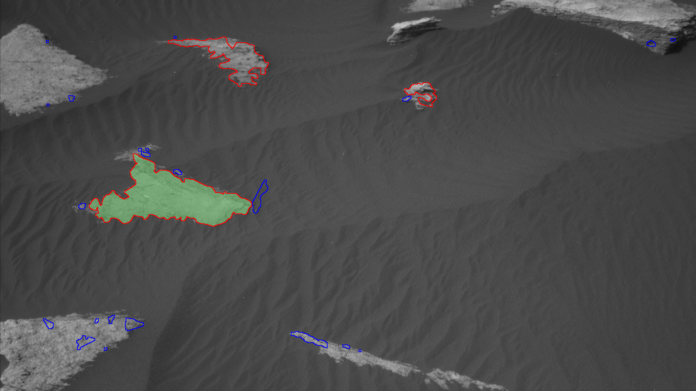 Ecco come appare la superficie di Marte vista da AEGIS. Tutti i target individuati dal programma di intelligenza artificiale sono evidenziati: quelli blu sono rigettati, quelli rossi sono quelli che invece vengono mantenuti. Il bersaglio migliore viene evidenziato in verde, se c’è un secondo preferito, viene evidenziato in arancione. Crediti: NASA/JPL-Caltech