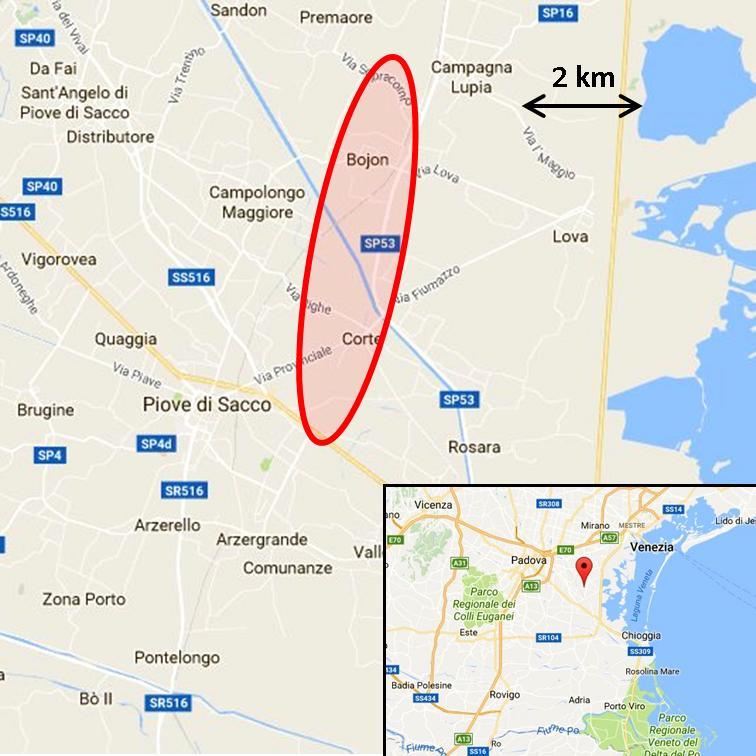 Gli studi sull’origine, composizione e traiettoria della meteora e le ricerche di eventuali frammenti del bolide sono iniziati subito dopo l’avvistamento da parte della stessa collaborazione Prisma, promossa e coordinata dall’Istituto nazionale di astrofisica, e nata alla fine dell’anno scorso proprio per lo studio e il monitoraggio di eventi del genere. «È stato un lavoro lungo e complesso, che arriva proprio a ridosso del 30 giugno, giorno dichiarato dall’ONU Asteroid Day» dice Daniele Gardiol, dell’Inaf di Torino, coordinatore nazionale del progetto Prisma. «L’analisi dei dati durante i 7 secondi in cui la meteora è stata visibile ha infatti permesso di definire un dettagliato modello matematico della fase di volo che tiene conto dell’influenza dei venti nella parte terminale “buia” e la zona di possibile caduta di frammenti meteoritici. I risultati dei calcoli indicano che prima del suo ingresso in atmosfera alla formidabile velocità di 54.000 km/h il meteoroide aveva una massa fra i 50 e i 200 kg, con una dimensione dell’ordine di 30-60 cm. Fortunatamente le riprese delle camere Prisma, integrate dal contributo fondamentale dato dalle osservazioni delle camere della rete Imtn (Italian Meteor and Tle Network), hanno permesso di concludere che l’oggetto si è in gran parte “sbriciolato” nelle fasi iniziali dell’impatto con l’atmosfera, ad una quota di circa 40 km, provocando molto probabilmente uno “sciame” di piccole meteoriti delle dimensioni di una pallina da golf e del peso di parecchie decine di grammi». I calcoli fanno ritenere che alcuni di questi frammenti siano caduti intatti a terra in una zona compresa fra i paesi di Piove di Sacco (PD) e Bojon, nel comune di Campolongo Maggiore (VE), dove potrebbe essere caduto il residuo principale del corpo cosmico, come indicato nella mappa qui sotto.