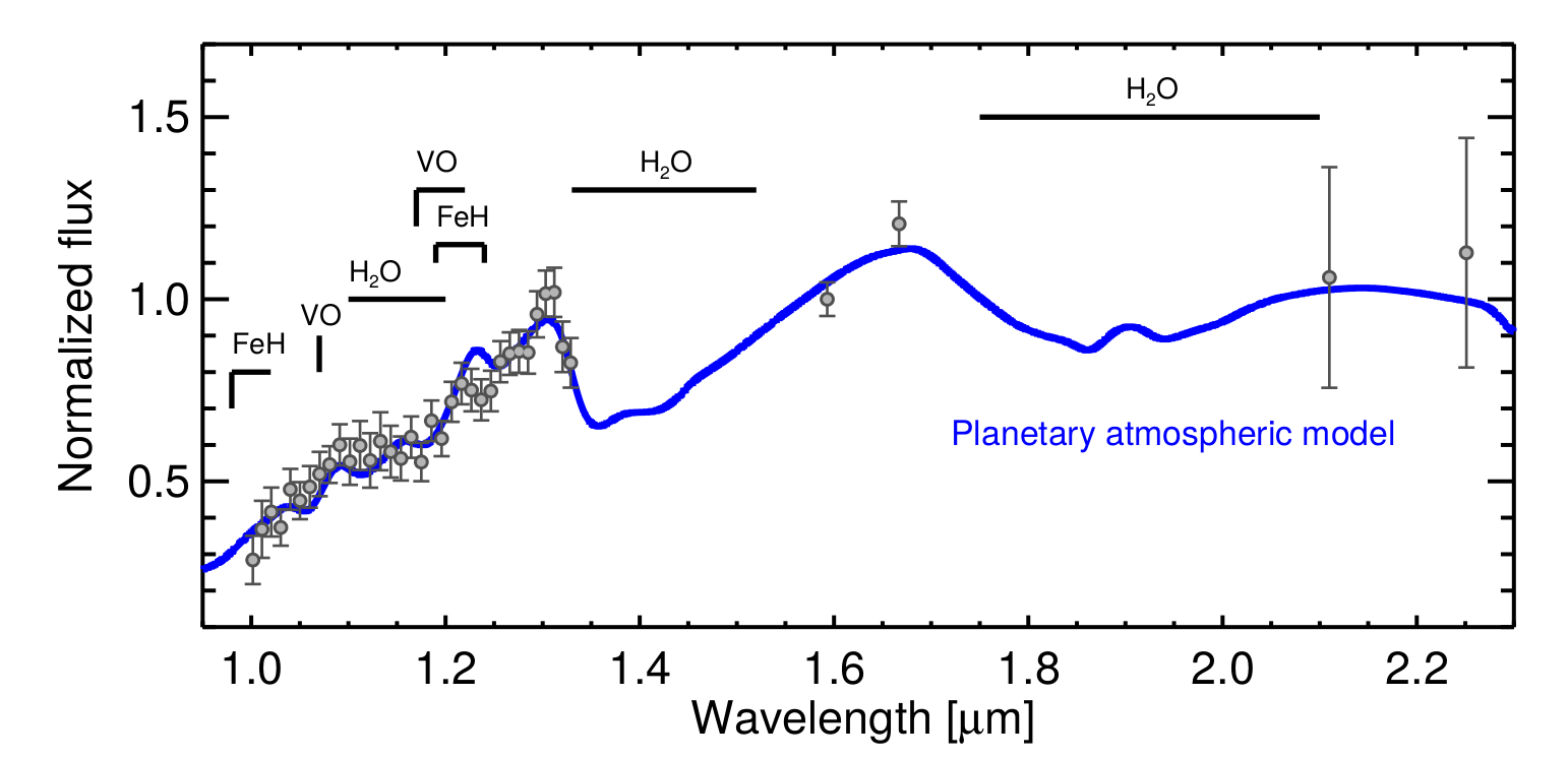 Lo spettro della luce dell’esopianeta HIP65426b nel vicino infrarosso che mostra la presenza, tra gli altri, di acqua nella sua atmosfera. Crediti: ESO/SPHERE Consortium/G. Chauvin et al.