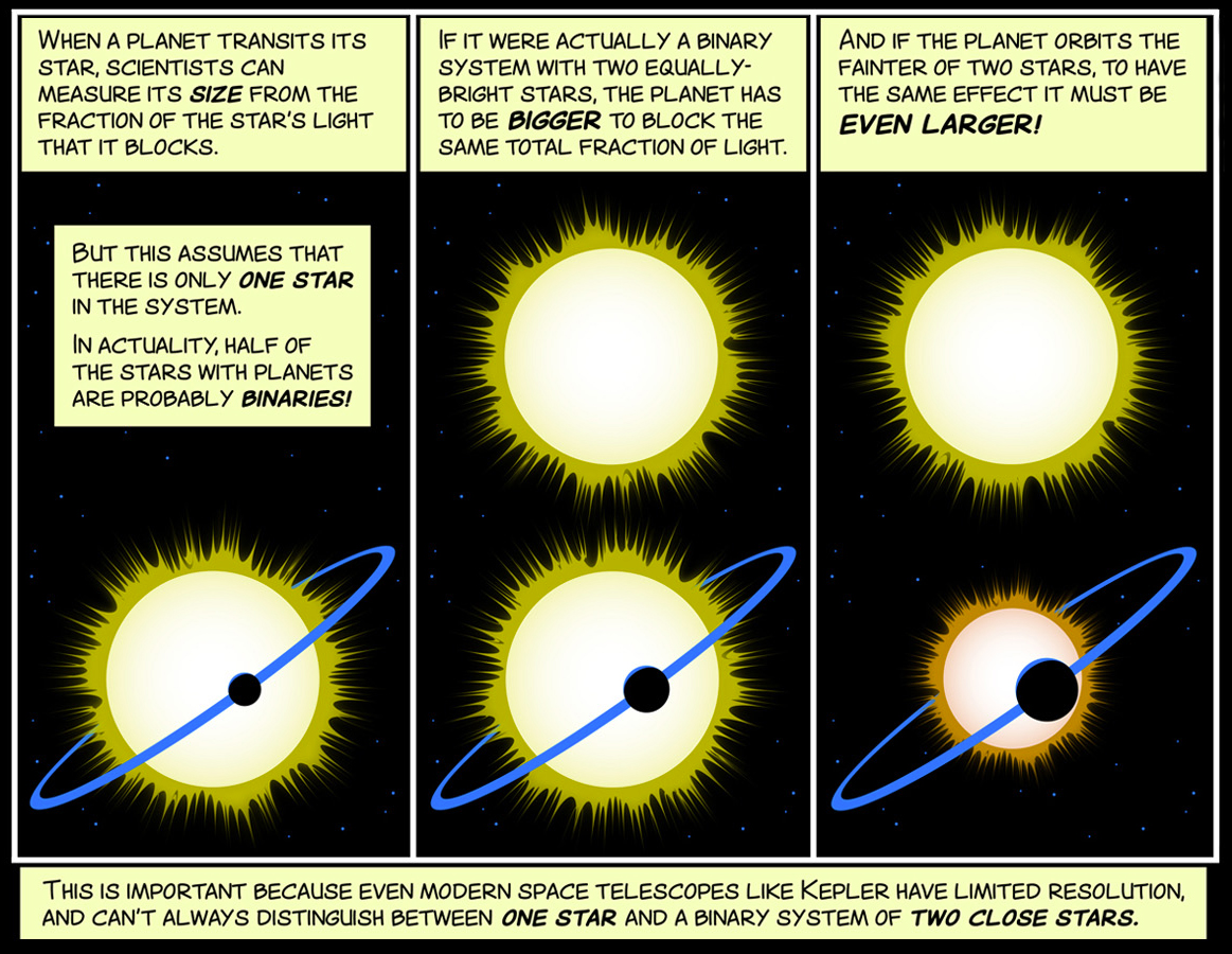 Questo fumetto spiega perché le dimensioni di alcuni esopianeti dovrebbero essere riviste nei casi in cui esiste una seconda stella nel sistema. Crediti: Nasa/Jpl-Caltech