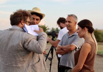 Da destra, Daria Guidetti e Jader Monari, i due astronomi dell’Inaf che interpretano se stessi, durante una pausa fra le riprese del film. A sinistra, con il cappello, il regista Germano Maccioni