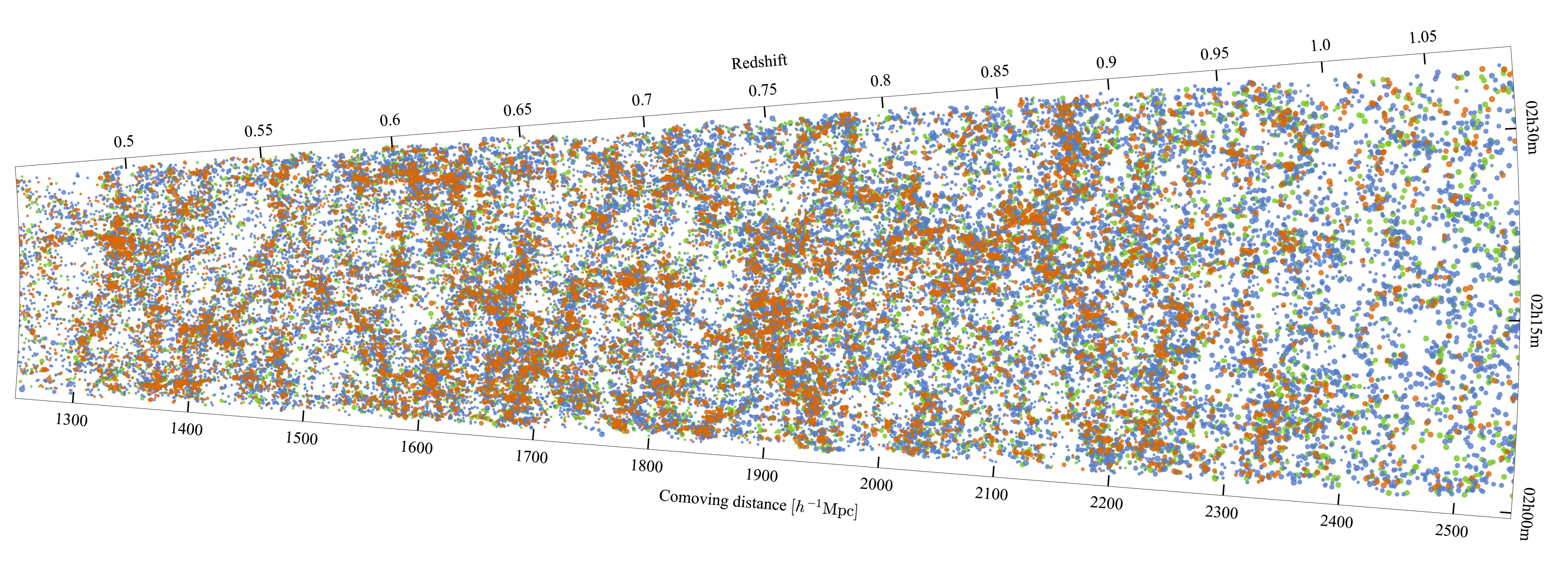 Qui sopra, la mappa della distribuzione di galassie su grande scala ottenuta dalla collaborazione Vipers: ogni punto colorato è una galassia, contenente a sua volta centinaia di miliardi di stelle. Mappe su scale anche maggiori di queste sono necessarie per la ricostruzione accurata della geometria e dell’evoluzione dell’universo. Cliccare per ingrandire