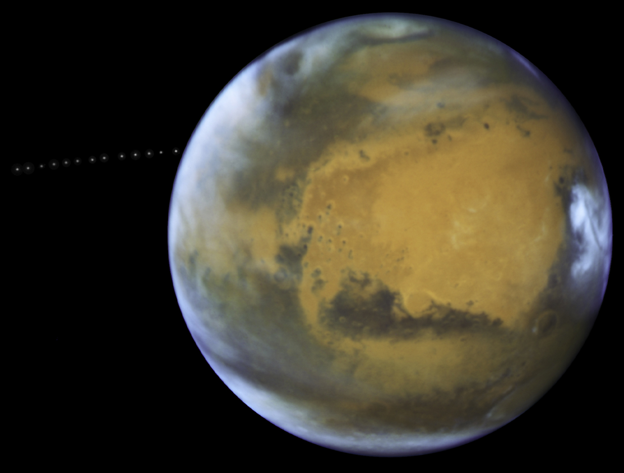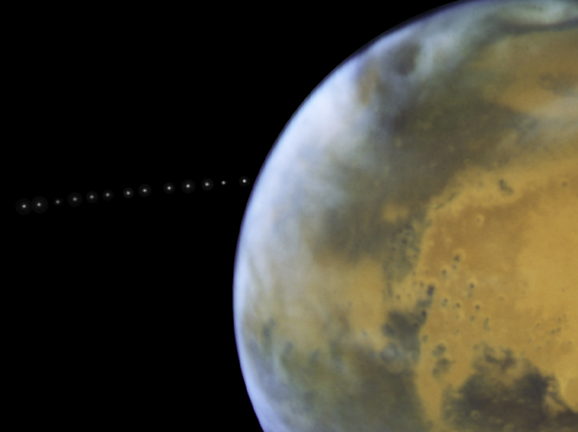 Nei 13 scatti distinti raccolti dallo strumento Wfc3/Uvis a bordo del telescopio spaziale la piccola luna marziana è poco più che un bagliore lontano, un puntino luminoso. Ma sono bastati, appunto, 22 minuti per fotografarne il rapido spostamento sull’orbita marziana.