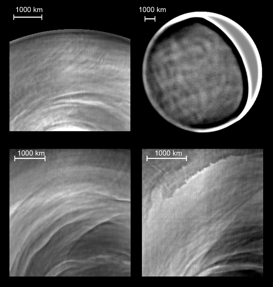 I nuovi tipi morfologici delle nuvole scoperte nel lato notturno di Venere grazie a Venus Express (ESA) e al telescopio infrarosso IRTF (NASA): le onde stazionarie (Venus Express, in alto a sinistra), schema a rete (IRTF, in alto a destra), filamenti misteriosi (Venus Express, in basso a sinistra) e instabilità dinamica (Venus Express, in basso a destra). Crediti: ESA e NASA