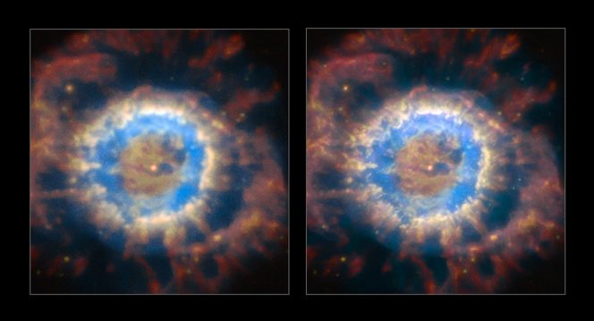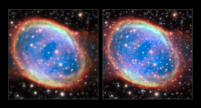 NGC 6563 è una nebulosa planetaria nella costellazione del Sagittario. L’immagine a sinistra è quella senza ottica adattiva, mentre per quella a destra era attivo l’Aof. Crediti: Eso / P. Weilbacher