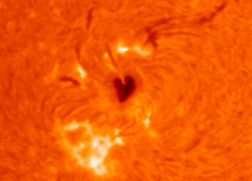 La macchia di cui parliamo è una grande macchia solare – 4,11 volte le dimensioni della Terra – comparsa nell’aprile 2016 all’interno della regione attiva Ar2529 (o Noaa 12529, adottando la nomenclatura della National Oceanic and Atmospheric Administration degli Stati Uniti). E le caratteristiche inedite della struttura di plasma che dà origine alla forma a cuore – confermate da osservazioni simultanee con il satellite giapponese Hinode – riguardano la polarità del campo magnetico, opposta a quella dell’ombra della macchia solare ospite, e la sua intensità, superiore a quella della penombra adiacente. I risultati dello studio sono in corso di pubblicazione su Astrophysical Journal Letters.
