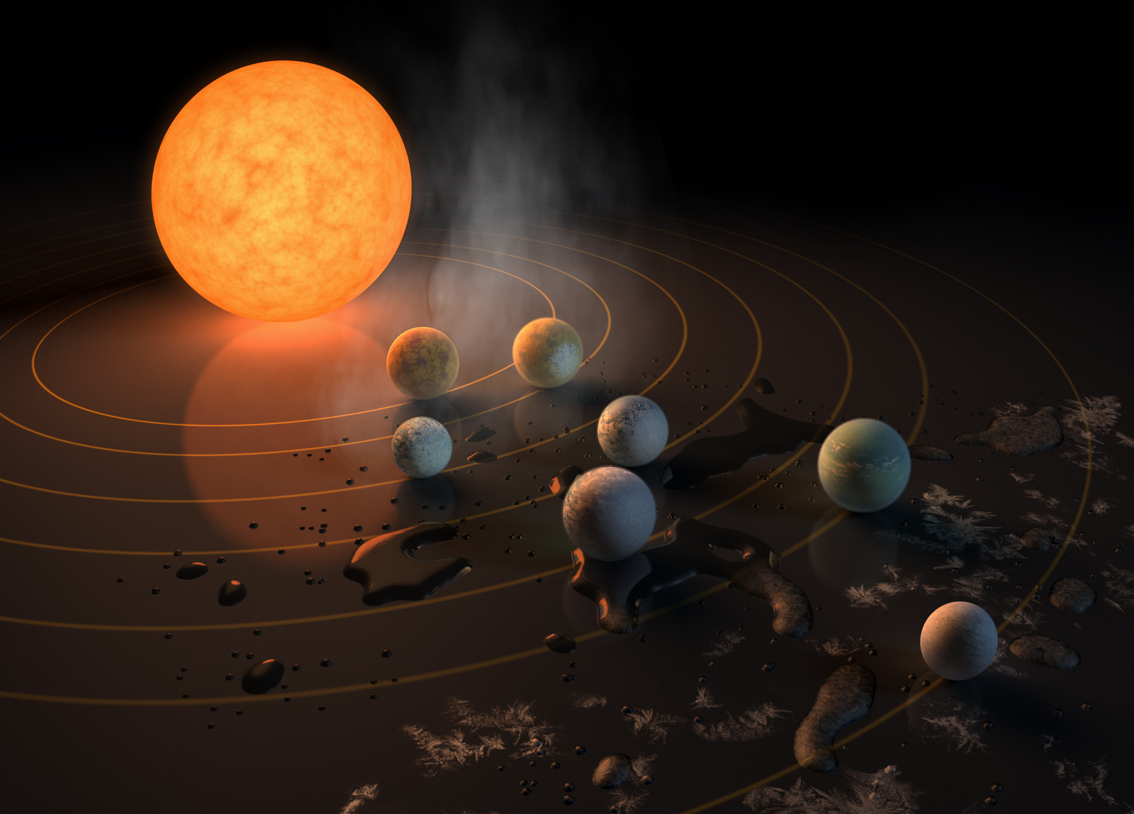 Il sistema multiplo attorno alla stella ultra-fredda Trappist-1 ha tre pianeti dalla struttura interna simile alla Terra nella regione di abitabilità. Crediti: Nasa/Jpl-Caltech