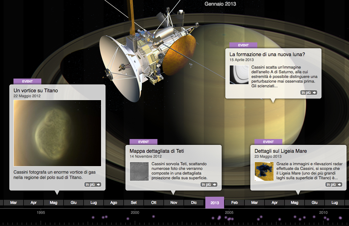 Il 15 settembre 2017, l’orbita di Cassini porterà la sonda all’interno dell’atmosfera di Saturno, terminando la propria lunga carriera soccombendo alle tremende temperature e pressioni che incontrerà durante la discesa. Per celebrare una fra le più spettacolari e longeve missioni d’esplorazione del Sistema solare, abbiamo creato una timeline interattiva che ripercorre le tappe più importanti di questo incredibile viaggio ventennale (cliccare per usarla):