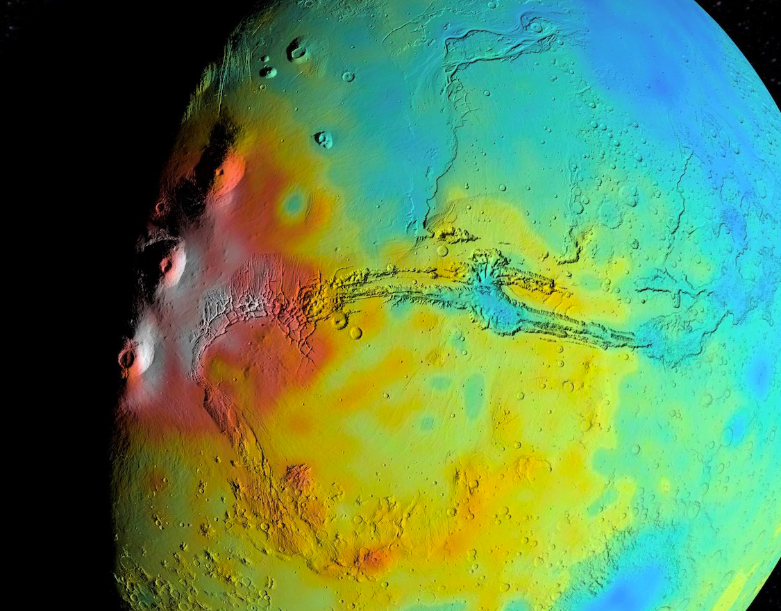 Una mappa dello spessore della crosta marziana basata sui nuovi dati di densità. Le regioni vulcaniche sono più dense e spesse, ma la differenza di densità è minore di quelli che si pensava. Al centro della mappa la Valles Marineris. Crediti: Nasa, Goddard Space Flight Center