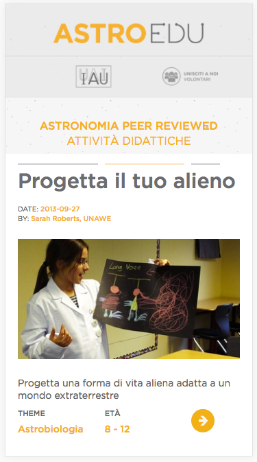 Nata nel 2010, a Cape Town, in Sud Africa, a latere del congresso Communicating Astronomy with the Public, astroEDU ha visto la luce con il lancio della versione inglese nel 2013. Da allora, sulla piattaforma internazionale, sono state pubblicate oltre 50 attività. astroEDU si prefigge fin dalla sua nascita di certificare la qualità delle pubblicazioni, migliorandone gli standard di qualità, visibilità e accessibilità. L’interfaccia è molto semplice, la ricerca rapida e veloce, le attività categorizzate in tanti modi diversi: per sorgente astronomica, per gruppi di età, per parole chiave e così via. Grande attenzione è stata posta al basso costo delle attività proposte, che spesso utilizzano materiale di recupero.
