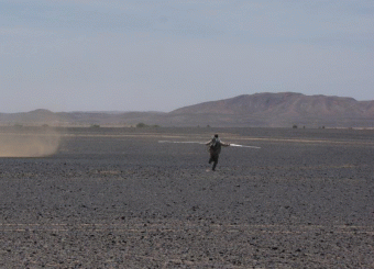 Animazione del riuscito campionamento “al volo” di un diavolo di sabbia da parte di Jan Raack in Marocco nel 2016. Crediti: Jan Raack/Dennis Reiss.