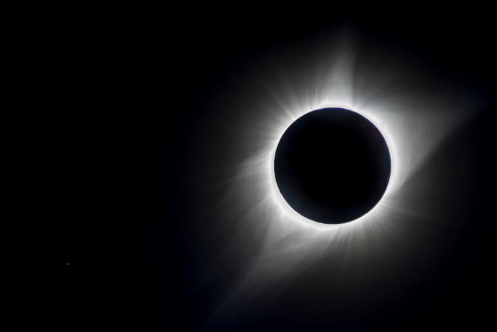 In questa immagine dell’eclisse totale di Sole del 21 agosto 2017, ripresa da Casper in Wyoming (Usa), la stella Regolo fa capolino come un puntino blu nell’angolo in basso a sinistra. Crediti: jmsands57