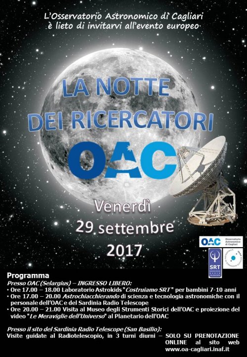 Sempre in Sicilia l’Istituto di Astrofisica Spaziale e Fisica Cosmica di Palermo parteciperà alla notte dei ricercatori il 29 settembre con varie attività. “Tra stelle di neutroni, buchi neri ed esplosioni cosmiche con i ricercatori dell’Inaf-Iasf Palermo”, visita” guidata alle attività di ricerca dell’istituto con l’aiuto di video, poster e modellini si svolgerà nella sala Tineo dell’Orto Botanico di Palermo. “Verso l’infinito e oltre! Esplorazioni nello spazio” è invece il laboratorio Astrokids che si svolgerà nella sala Tineo dell’Orto Botanico: i piccolo ospiti verranno invitati a creare e osservare crateri, pianeti e costellazioni. Due presentazioni per la Science Happy Hour si svolgeranno poi presso il “Caffè Internazionale” di Palermo: “The dark side of the universe: materia oscura ed energia oscura” e “Il grande, il piccolo, l’io: storia del Cosmo a uso dei suoi abitanti”.
