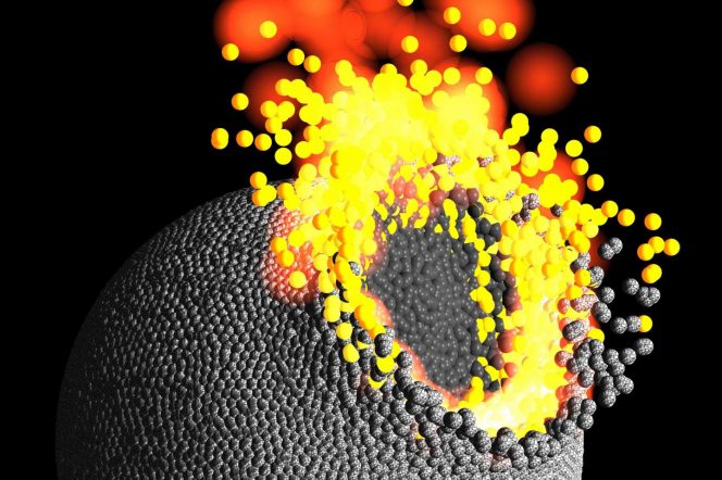 Simulazione computerizzata di due pianeti (relativamente piccoli) che si scontrano tra loro. I colori mostrano come la roccia del corpo impattante (grigio scuro, al centro dell’area d’impatto) si scontra col corpo bersagliato (la roccia in grigio chiaro), mentre parte della roccia nell’area d’impatto si fonde (da giallo a bianco) o viene vaporizzata (rosso). Crediti: Philip J. Carter