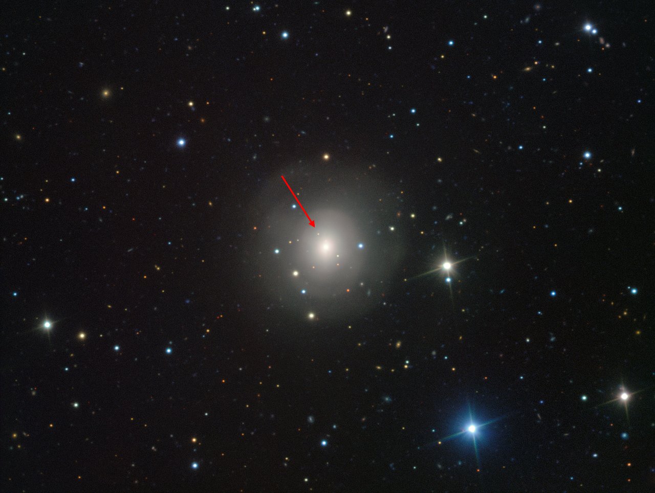Immagine VIMOS della galassia Ngc 4993 che mostra (indicata dalla freccia) la controparte ottica della fusione di una coppia di stelle di neutroni. Crediti: Eso