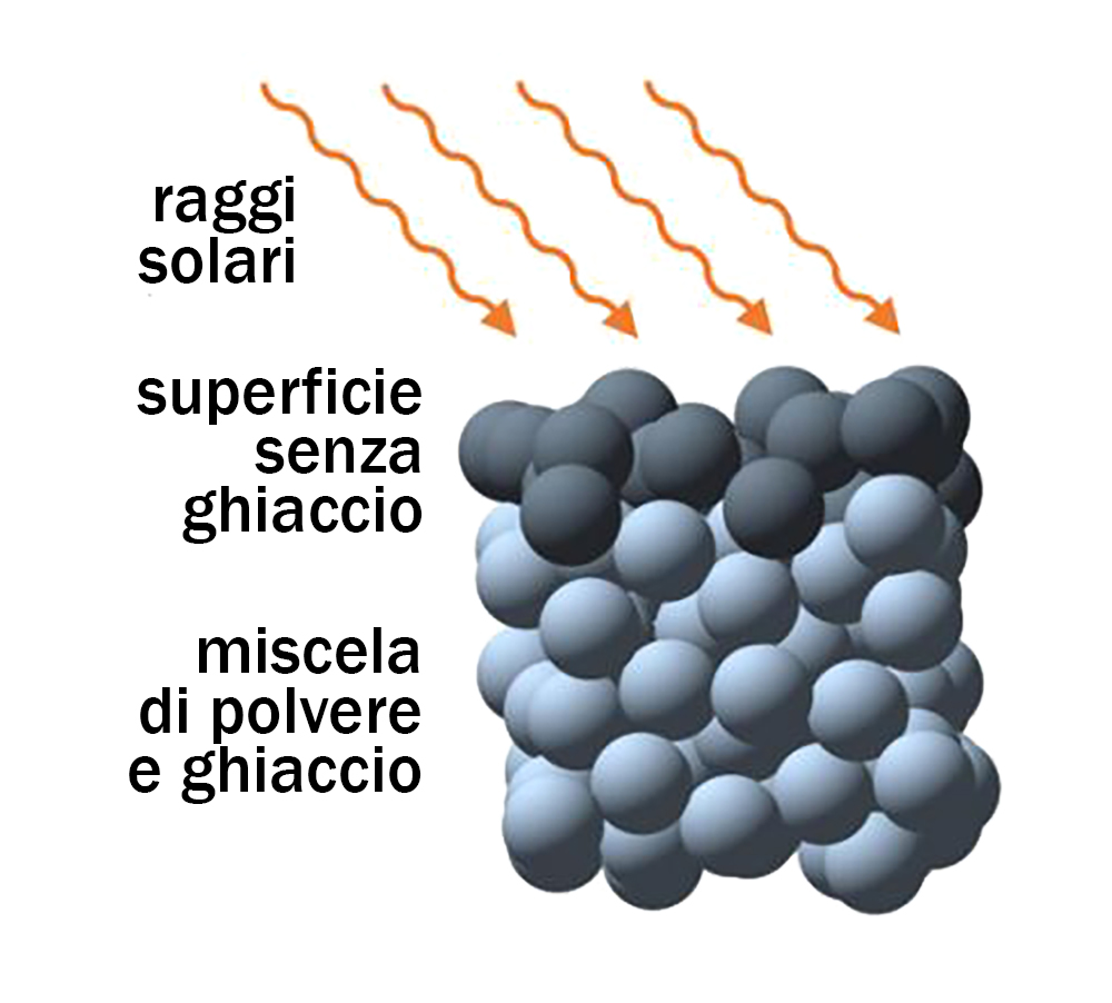 La risposta viene dalla struttura di 67P, desunta dalle osservazioni di Rosetta: la cometa è un corpo granulare, un aggregato di ciottoli “primordiali” di dimensioni millimetriche, contenenti polvere e ghiaccio; solo gli strati più superficiali, che sono esposti alla luce solare diretta, non contengono ghiaccio.
