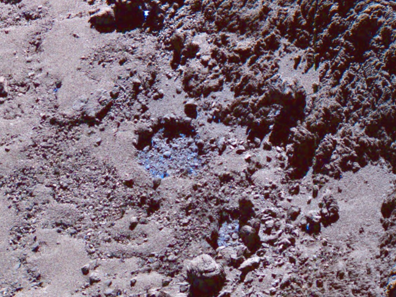 Il 3 luglio 2016 un getto di polvere è stato avvistato all’interno della depressione piena di ghiaccio vicino al grande masso verso il fondo del fotogramma. Questa immagine è una composizione in falsi colori, dove le macchie azzurre evidenziano la presenza e la posizione del ghiaccio d’acqua. Crediti: ESA/Rosetta/MPS for OSIRIS Team MPS/UPD/LAM/IAA/SSO/INTA/UPM/DASP/IDA