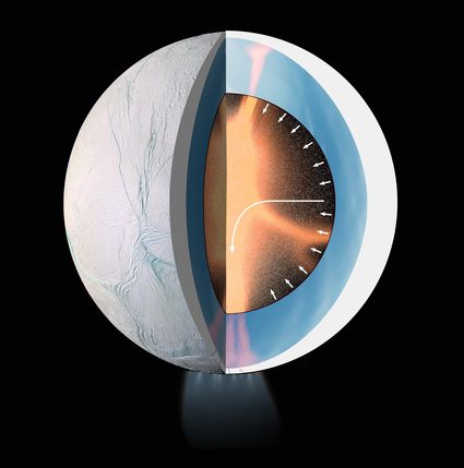 Dai “camini” sul fondale (seafloor hotspot) fuoriesce una vigorosa colonna d’acqua calda che scioglie la crosta di ghiaccio sovrastante e trasporta con sé piccole particelle strappate dal fondale. Nel giro di mesi o settimane, alcune di queste particelle vengono rilasciate nello spazio dai getti ghiacciati, come ha potuto constatare la sonda Cassini.