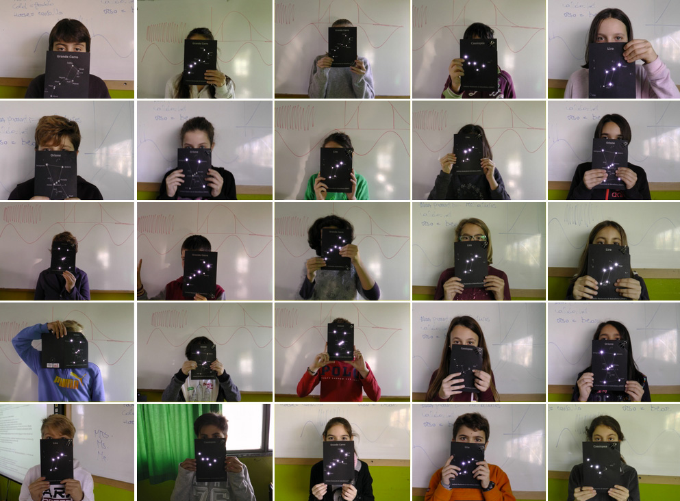 Bambine e bambini con le “costelazioni luminose” da loro stessi realizzate: una delle tante attività didattiche proposte dall’Inaf in occasione della settimana della luce 2017. Crediti: Matteo Boni, Sara Ricciardi e Sara Venturi / Iasf Bologna