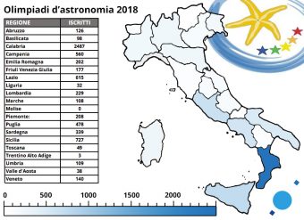 Le Olimpiadi italiane di astronomia hanno superato se stesse con questo record di partecipazione, che batte quello della scorsa stagione, che contò 5946 iscrizioni. Tra tutte le regioni, spicca l’affluenza degli studenti dalle regioni del Sud: la Puglia (478 iscritti), la Campania (560), la Sicilia (727) e in particolare la Calabria, che con ben 2487 studenti in gara rappresenta quasi un iscritto su tre.