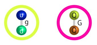 Le strutture fondamentali di un pione (a sinistra) e di un’ipotetica Simp (particella massiva fortemente interagente). I pioni sono formati da un quark up e un antiquark down, con un gluone (g) che li tiene insieme. La Simp qui proposta sarebbe invece formata da un quark e un antiquark tenuti insieme da un tipo di gluone (G) sconosciuto. Crediti: UC Berkeley