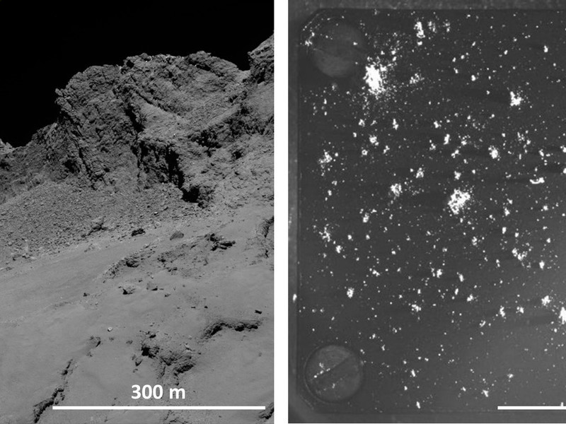 A sinistra, la superficie della cometa 67/P. A destra, campioni di polvere cometaria analizzati da Cosima. Crediti: Esa/Rosetta