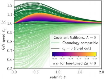 I dati ricavati dalla fusione di stelle di neutroni osservata il 17 agosto fanno scartare una serie di teorie sull’energia oscura. Questo grafico mostra centinaia di varianti della cosmologia Galileon, dove quelle in verde-sfumato sono le sfavorite dalle osservazioni. Crediti: Berkeley Lab, Physical Review Letters