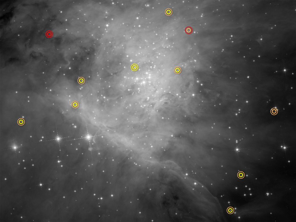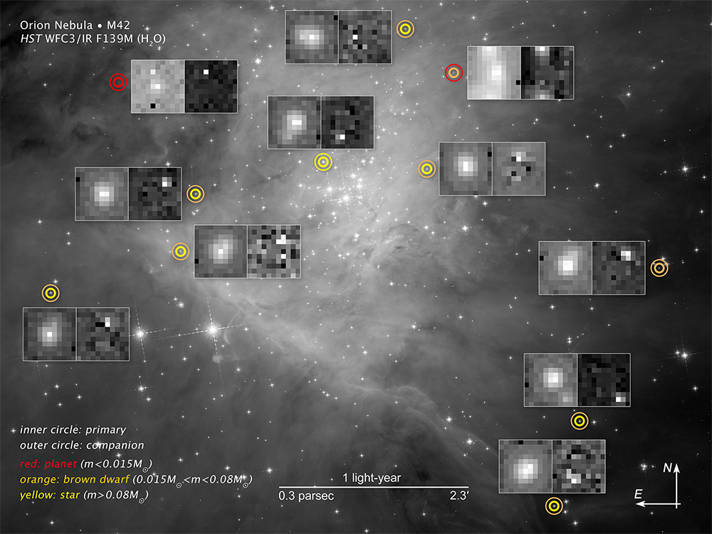 L’immagine fa parte di una survey condotta da Hubble alla ricerca di stelle di piccola massa, nane brune e pianeti nella nebulosa di Orione. Ogni cerchio identifica una coppia di oggetti, che però appaiono come un unico punto luminoso. Per separare la luce stellare degli oggetti, gli esperti hanno utilizzato speciali tecniche di elaborazione delle immagini. Il cerchio interno più spesso rappresenta il corpo primario, mentre il cerchio esterno più sottile indica il compagno. I cerchi sono codificati a colori: rosso per un pianeta, arancione per una nana bruna e giallo per una stella. In alto a sinistra c’è un sistema binario di pianeti orfani della loro stella, mentre al centro sulla destra c’è una coppia di nane brune. La porzione analizzata da Hubble misura circa 4×3 anni luce. Crediti: NASA , ESA, and G. Strampelli (STScI)