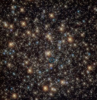 Questa immagine ottenuta con il telescopio spaziale Hubble di Nasa/Esa mostra la zona centrale del ricco ammasso globulare Ngc 3201 nella costellazione australe della Vela. Una stella, indicata con un cerchio blu, è in orbita intorno a un buco nero di massa pari a quattro volte quella del Sole. Crediti: Esa/Nasa