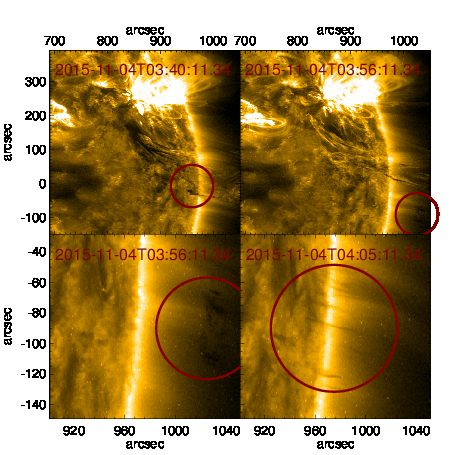 La sequenza di immagini dall’Atmospheric Imaging Assembly a bordo di Sdo dell’evento del 4 novembre 2015 analizzato in questo studio
