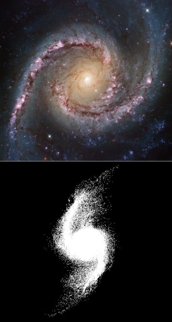 In alto: immagine della galassia a spirale Ngc 1566 presa dal Telescopio Hubble. Crediti: Nasa and The Hubble Heritage Team (Stsci/Aura). In basso: risultato di una simulazione al computer di un sistema di un milione di particelle auto-gravitanti. Crediti:David Benhaiem e Francesco Sylos Labini