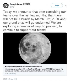 Nella loro dichiarazione, Peter H. Diamandis e Marcus Shingles, fondatore e amministratore delegato della X Prize fundation, si dicono straordinariamente grati a Google per aver reso possibile questa avventura di dieci anni e per aver avuto la lungimiranza e il coraggio di supportare e catalizzare il settore spaziale commerciale, obiettivo finale di questa competizione. «Grazie a questa competizione», scrivono, «abbiamo acceso il dibattito e cambiato le aspettative della gente riguardo a chi può sbarcare sulla Luna. Molte persone sono ora convinte che questo genere di missioni non sia più una competenza esclusiva di alcune agenzie governative, ma che l’obiettivo possa essere raggiunto anche da piccoli team di imprenditori, ingegneri e innovatori di tutto il mondo. Siamo riconoscenti ai team partecipanti per il duro lavoro compiuto negli ultimi dieci anni, e siamo consapevoli che un certo numero di questi team stanno proseguendo la costruzione dell’hardware di volo, contrattando con i fornitori per il lancio e sono prossimi a realizzare la missione di atterrare sulla Luna».