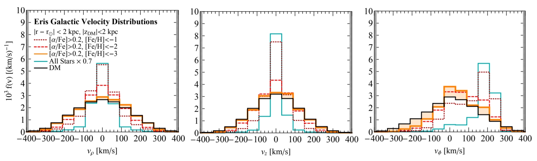 Distribuzioni delle tre componenti di velocità della materia oscura (linea nera) e delle stelle, nella simulazione Eris. Le distribuzioni stellari sono mostrate separatamente per diverse metallicità: -1 (equivalente a una abbondanza di metalli dieci volte minore a quella del Sole), -2 (equivalente a una abbondanza di metalli cento volte minore a quella del Sole) e -3 (equivalente a una abbondanza di metalli mille volte minore a quella del Sole), rispettivamente con la linea marrone a puntini, rossa tratteggiata e arancione. Da Empirical Determination of Dark Matter Velocities using Metal-Poor Stars di Herzog-Arbeitman et al. 2018