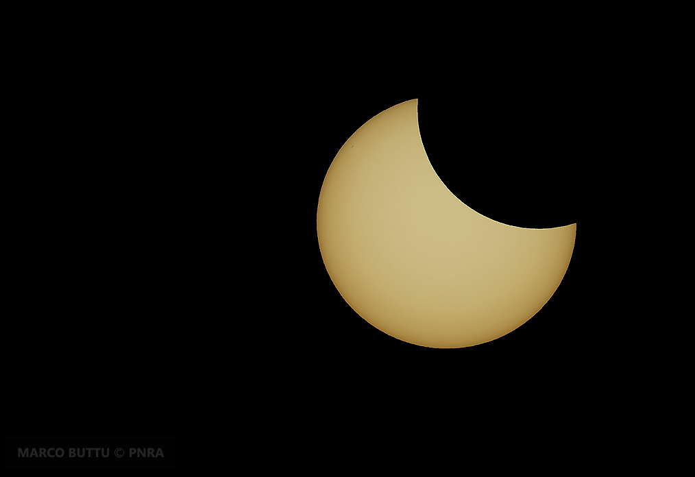 Questa foto è stata scattata da Marco Buttu alle 4 di mattina (ora locale a Concordia Station) nel momento di picco dell’eclissi. Dati tecnici: Canon 7D mark II, Canon 100-400 IS II @400mm, treppiede, apertura f10, tempo 1/5000 di secondo, filtro ND 64x più un secondo filtro sistemato con nastro adesivo sul tappo dell’obiettivo, crop 50 per cento. Crediti: Marco Buttu / Pnra