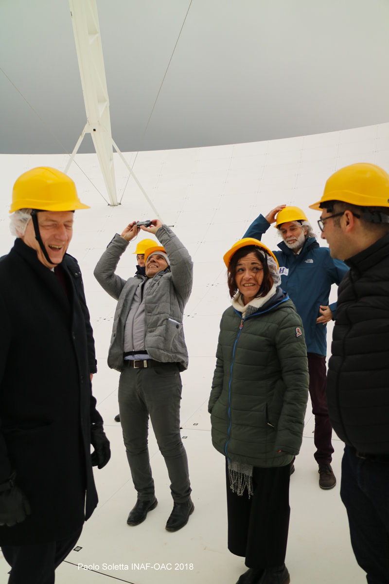 Oltre al numeroso staff Inaf già presente all’antenna, con a capo il responsabile di stazione Andrea Orlati, a fare gli onori di casa sono intervenuti Emilio Molinari, direttore dell’Inaf-Osservatorio Astronomico di Cagliari, e Federica Govoni, ricercatrice di Cagliari recentemente nominata a capo dell’Unità nazionale che coordina le partecipazioni internazionali in radioastronomia e tutti i radiotelescopi italiani dell’Inaf: Noto, Medicina e il Sardinia Radio Telescope.
