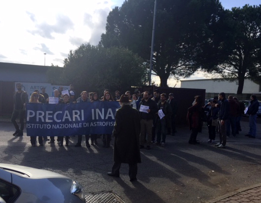 Di spalle, con il cappello, Vito Francesco Polcaro lo scorso novembre, mentre va a dare supporto a un gruppo di precari dell’Inaf. Crediti: Anna Di Giorgio / Inaf Iaps