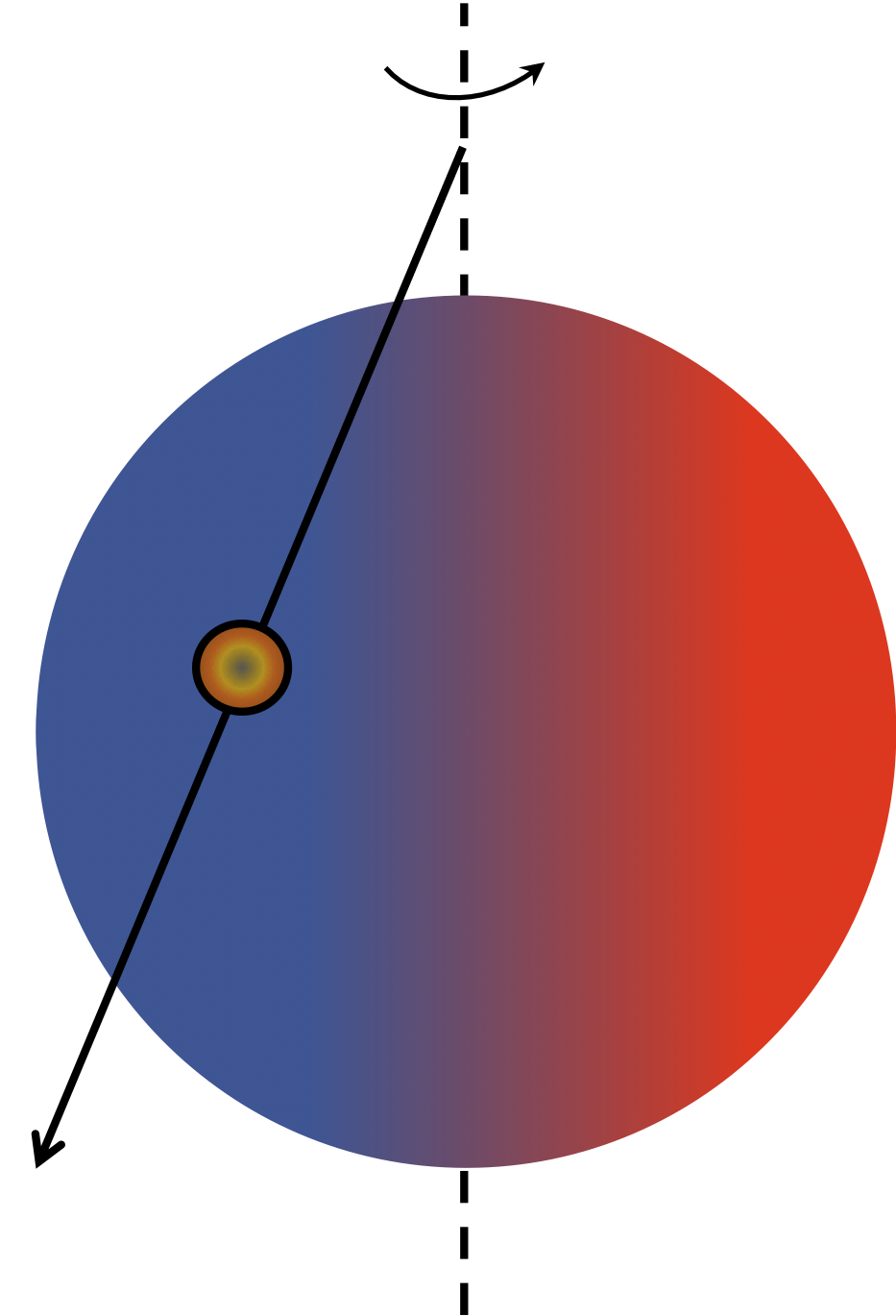 Lo schema mostra il pianeta Wasp-60b in fase di transito davanti alla sua stella. La linea tratteggiata rappresenta l’asse di rotazione stellare. La freccia indica il percorso seguito dal pianeta.