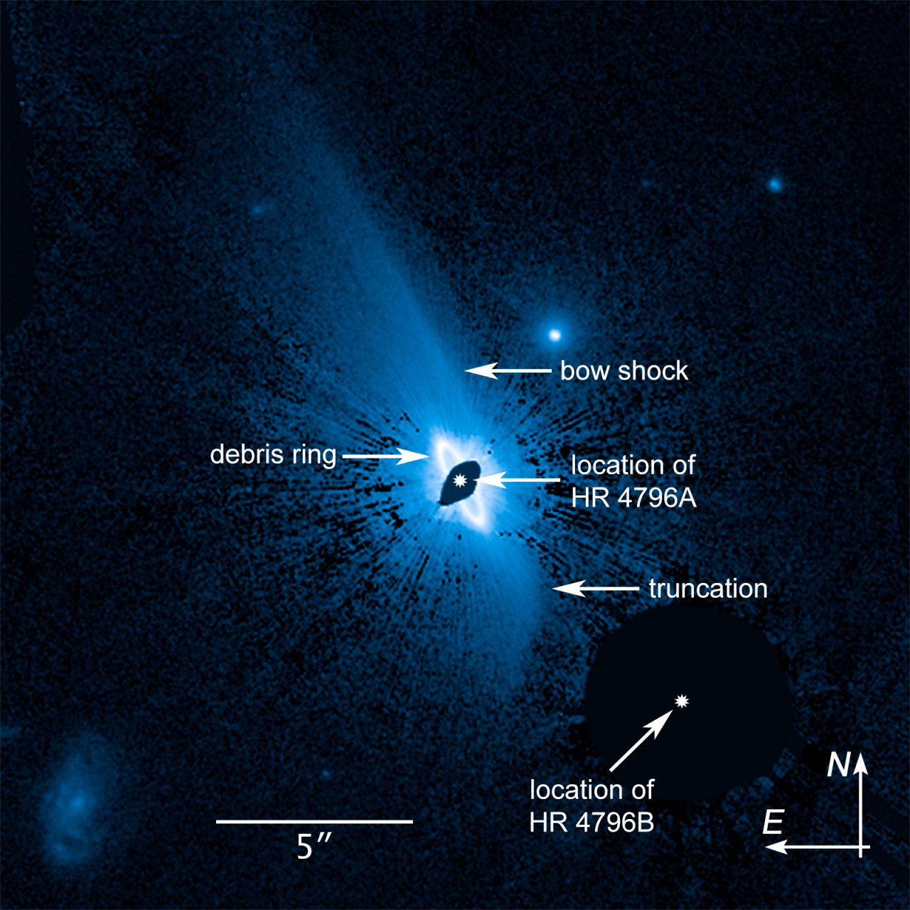 La nuova osservazione con Hubble del sistema di detriti attorno alla stella Hr 4796A. La stella compagna 4796B si trova in basso a destra, anch’essa oscurata. Crediti: Nasa/Esa/G. Schneider (Univ. of Arizona)