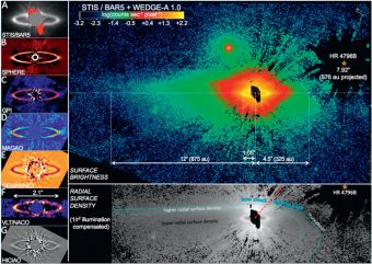 Glenn Schneider, astrofisico dello Steward Observatory all’Università dell’Arizona, ha guidato un’osservazione con il telescopio spaziale Hubble della giovane stella Hr 4796A. In un articolo da poco pubblicato su Astronomical Journal, Schneider e colleghi illustrano come, oltre al denso disco circumstellare già conosciuto, vi sia un secondo, vastissimo e rarefatto, alone di polveri più esterno, che si estende per qualcosa come 875 volte la distanza Terra-Sole (Ua, Unità astronomiche).