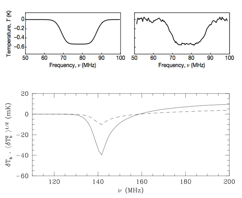 Nei riquadri in alto, il grafico che mostra l’effetto della riga d’assorbimento dell’idrogeno osservato da Edges sulla radiazione cosmica di fondo all’epoca della fine dell’era oscura (fonte: Judd D. Bowman et al., Nature 2018). In basso, il segnale previsto nel 2000 da Paolo Tozzi et al. (fonte: Apj)