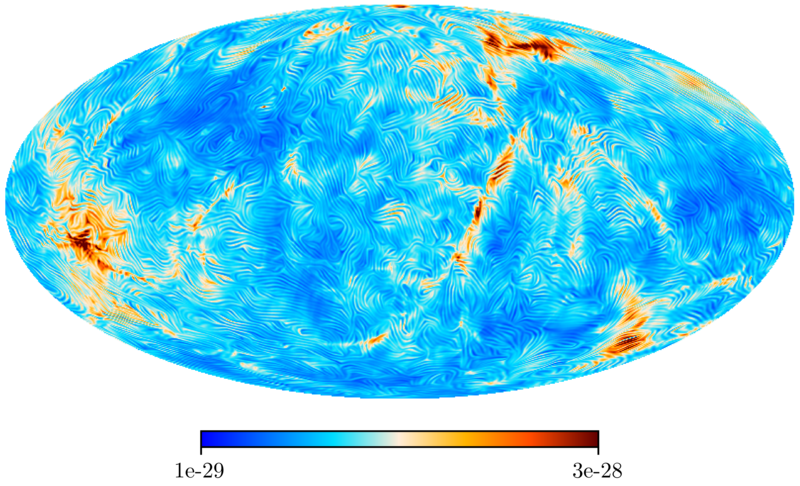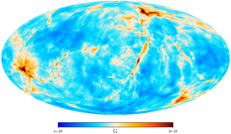 Le informazioni necessarie per ottenere queste simulazioni sono contenute nella distribuzione delle galassie che ci circondano, poiché questo è il risultato del moto della materia sin dall’universo primordiale. Poiché conosciamo le leggi che portano alla formazione delle galassie, dall’odierna distribuzione delle galassie è possibile – seppure con qualche incertezza – tracciare l’evoluzione della distribuzione della materia dall’universo primordiale ai giorni nostri. Ciò significa che, sapendo interpretare i dati, sono disponibili le informazioni necessarie per prevedere intensità e distribuzione dei campi magnetici generati dall’effetto Harrison nell’universo di oggi. I ricercatori hanno utilizzato questa idea per calcolare i residui di quei campi magnetici primordiali nel nostro vicinato cosmico, vale a dire in una sfera dal raggio di 300 milioni di anni luce. Questi campi magnetici sono estremamente deboli, ovvero un miliardo di miliardi di miliardi di volte più bassi del campo magnetico terrestre. Nonostante questi valori piccolissimi, il team è stato in grado di prevedere con precisione la struttura del campo magnetico vista dalla Terra e in luoghi noti nell’Universo.
