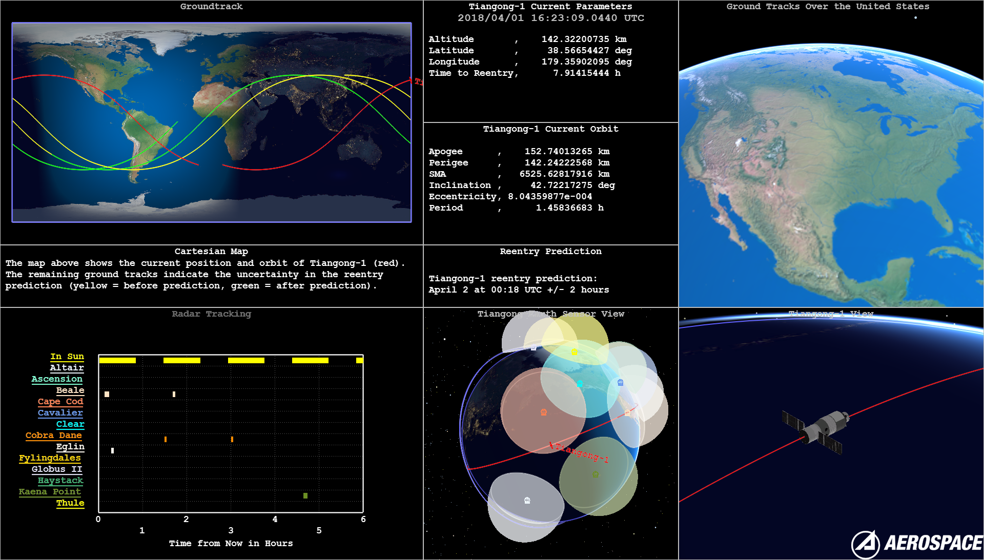 I dati orbitali e le possibili ultime traiettorie della Tiangong-1 a qualche ora dal suo rientro in atmosfera. Crediti: The Aerospace Corporation
