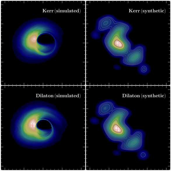 «Abbiamo degli occhi ben affinati. Sebbene le immagini simulate siano molto simili, di fatto sono distinguibili e abbiamo sviluppato una serie di strumenti che ci consentono di vedere le differenze. Una delle cose che si possono notare facilmente è che nel caso di un buco nero di Kerr il massimo dell’emissione, indicato dalla croce rossa nella figura riportata sopra, è adiacente all’orizzonte. Nel caso del buco nero dilatonico, non è così. Questo spostamento è un rivelatore importante che quello non può essere un buco nero di Kerr. Tuttavia, introducendo le distorsioni strumentali questa differenza scompare; da qui le nostre conclusioni».