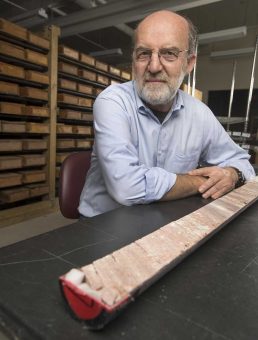 Dennis Kent con una porzione di un nucleo roccioso lungo oltre 500 metri proveniente dalla Foresta pietrificata, in Arizona. Crediti: Nick Romanenko/Rutgers University-New Brunswick