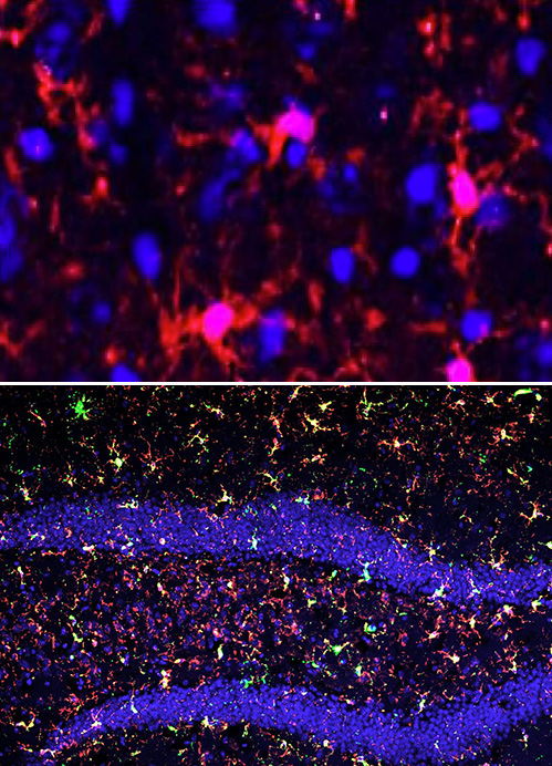In alto: microglia (in rosso) di topo sana. In basso: microglia attivata (in rosso e verde) nell’ippocampo di un topo irradiato (in entrambe le immagini, in blu sono rappresentati nuclei di cellule per riferimento anatomico). Crediti: Rosi Lab / Ucsf