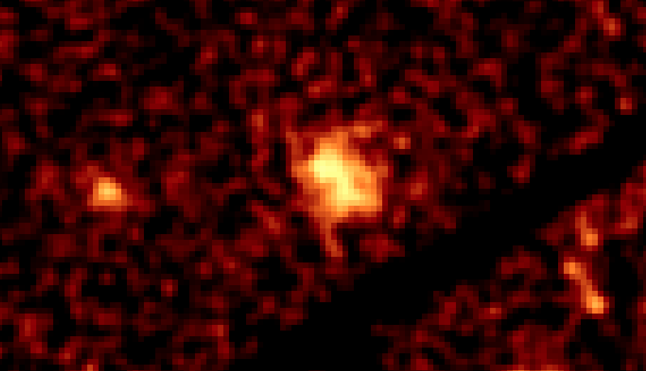 Immagine presa nei raggi X dal telescopio spaziale Xmm-Newton dell’Esa che mostra l’emissione associata alla sorgente di onde gravitazionali Gw170817 e quella associata al nucleo della galassia ospite, NGC 4993 . Crediti: Esa/Xmm-Newton, P. D’Avanzo (Inaf)