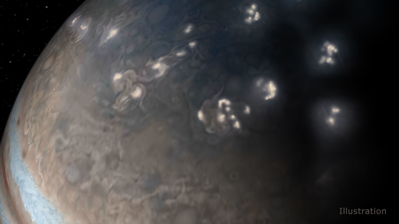 Rappresentazione artistica della distribuzione dei fulmini nell’emisfero settentrionale di Giove in un’immagine scattata dalla JunoCam. I dati della missione Juno della Nasa indicano che la maggior parte dell’attività dei fulmini su Giove è vicina ai suoi poli. Crediti: Nasa / Jpl-Caltech / SwRI / JunoCam
